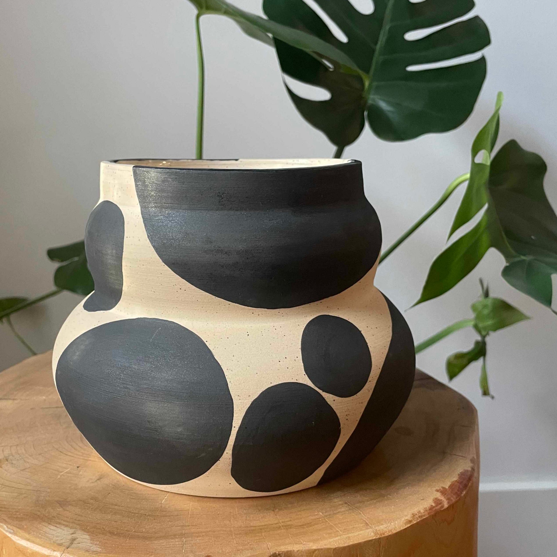 Stoneware vase with black blob decoration and white glazed interior.